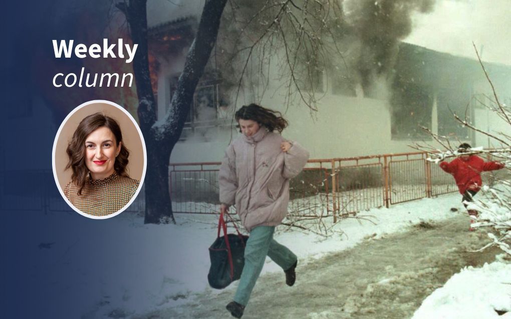 A woman and girl flee from a burning kindergarten in the region of Sarajevo, during the war in 1996. Photo AFP, Dimitri Messinis, Canva
